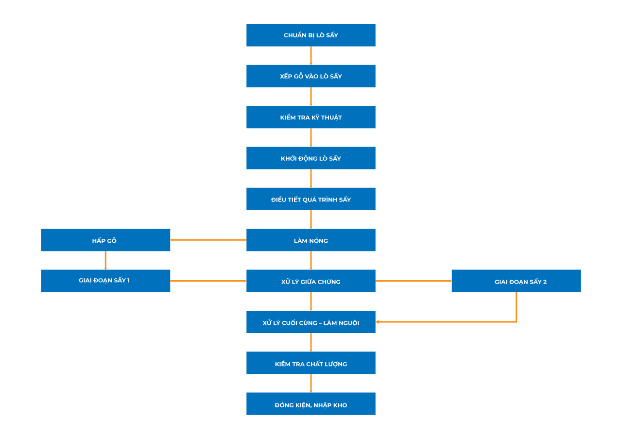 Thời gian cho bước này sẽ được tính tùy theo dộ dày của gỗ, được thực hiện chung bởi công nhân sấy và cán bộ ký thuật với quy trình theo các công đoạn nhỏ như sau: